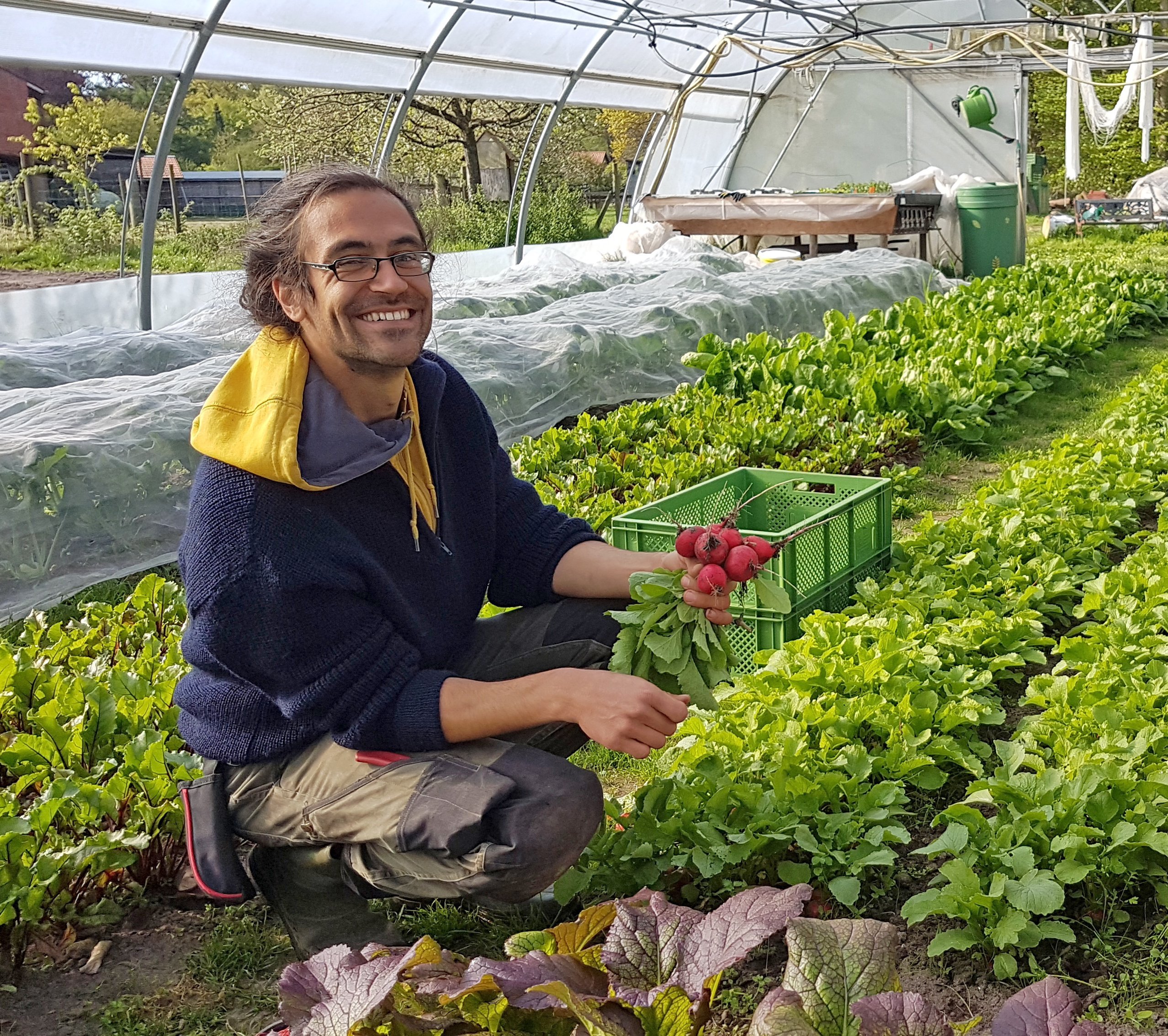 Sascha Müller arbeitet seit acht Jahren als Gärtner in verschiedenen Betrieben in Norddeutschland, zuletzt in der kleinen Solawi Schürhof in Neuenkirchen-Vörden. Im Netzwerk Solidarische Landwirtschaft war er vor allem beim Aufbau der selbstorganisierten Gemüsebau-Ausbildung aktiv. Außerdem ist er Mitglied im noch jungen Verein Ernährungsrat Osnabrück.